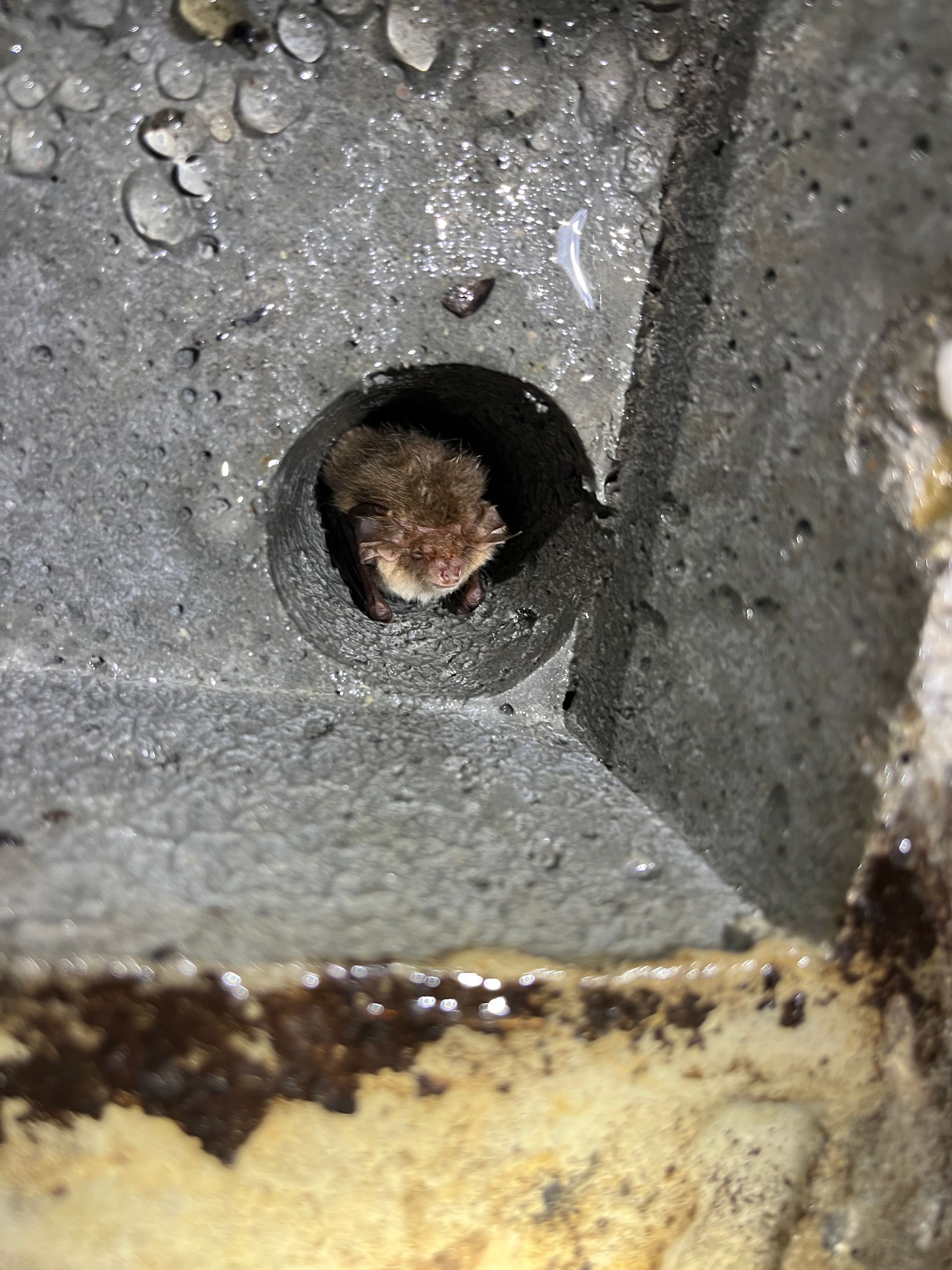 Tussen de betonplaten ontstaan natuurlijke kieren, die door hun schuine kanten mooie wegkruipplekken vormen. Maar deze kieren kunnen ook toegangen worden voor gravende dieren. Daarom sluiten we deze altijd; (bos)muizen kunnen slapende vleermuizen aanvreten.