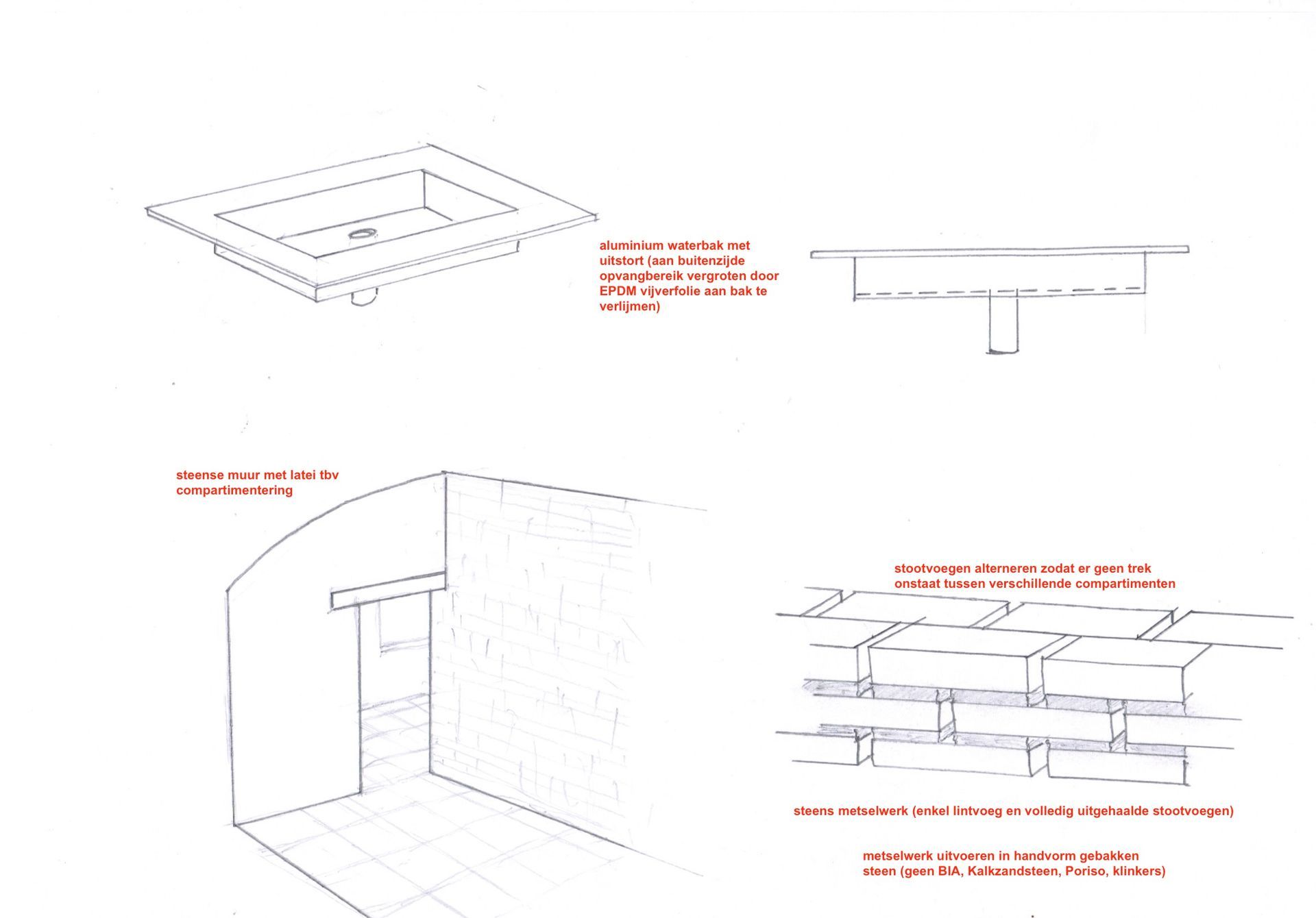 Er is ook een water-verzamelbak in de oude boventoegang van de ijskelder geplaatst. Via die oude toegang werd er vroeger ijs in de kelder aangevoerd. Deze RVS bak, het oppervlak is vergroot met vijverfolie, is onder het maaiveld van het zanddek OP de ijskelder geplaatst zodat deze wat regenwater opvangt. De afvoer van deze bak komt precies uit op de oude verdeelmuur zodat deze het vocht langzaam kan verspreiden in de ruimtes. Er is gekozen voor deze kunstgreep, omdat er door de relatief kleine ruimte en nauwelijkse tochtwerking de aangevoerde lucht kan condenseren in/op de metselstenen.