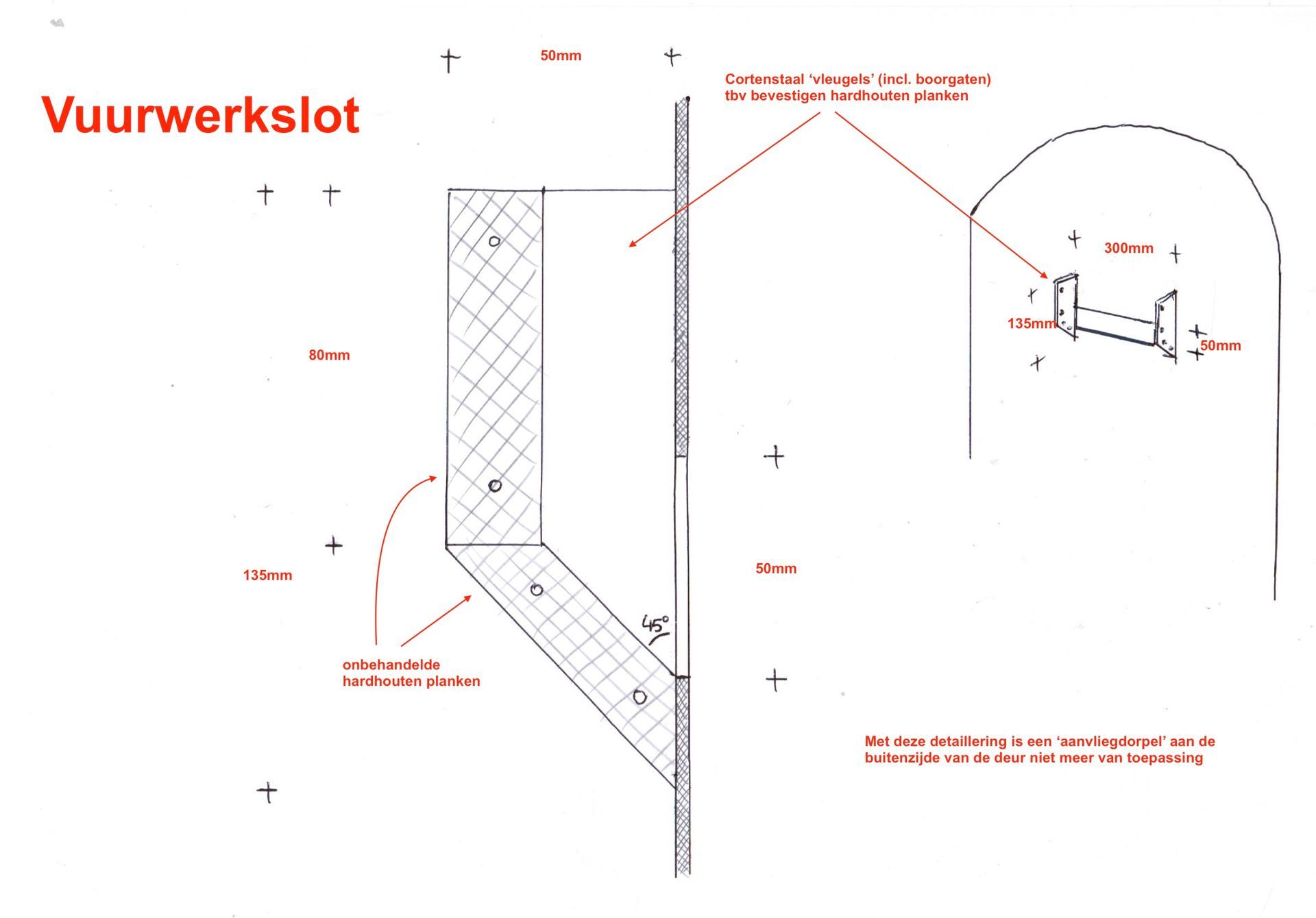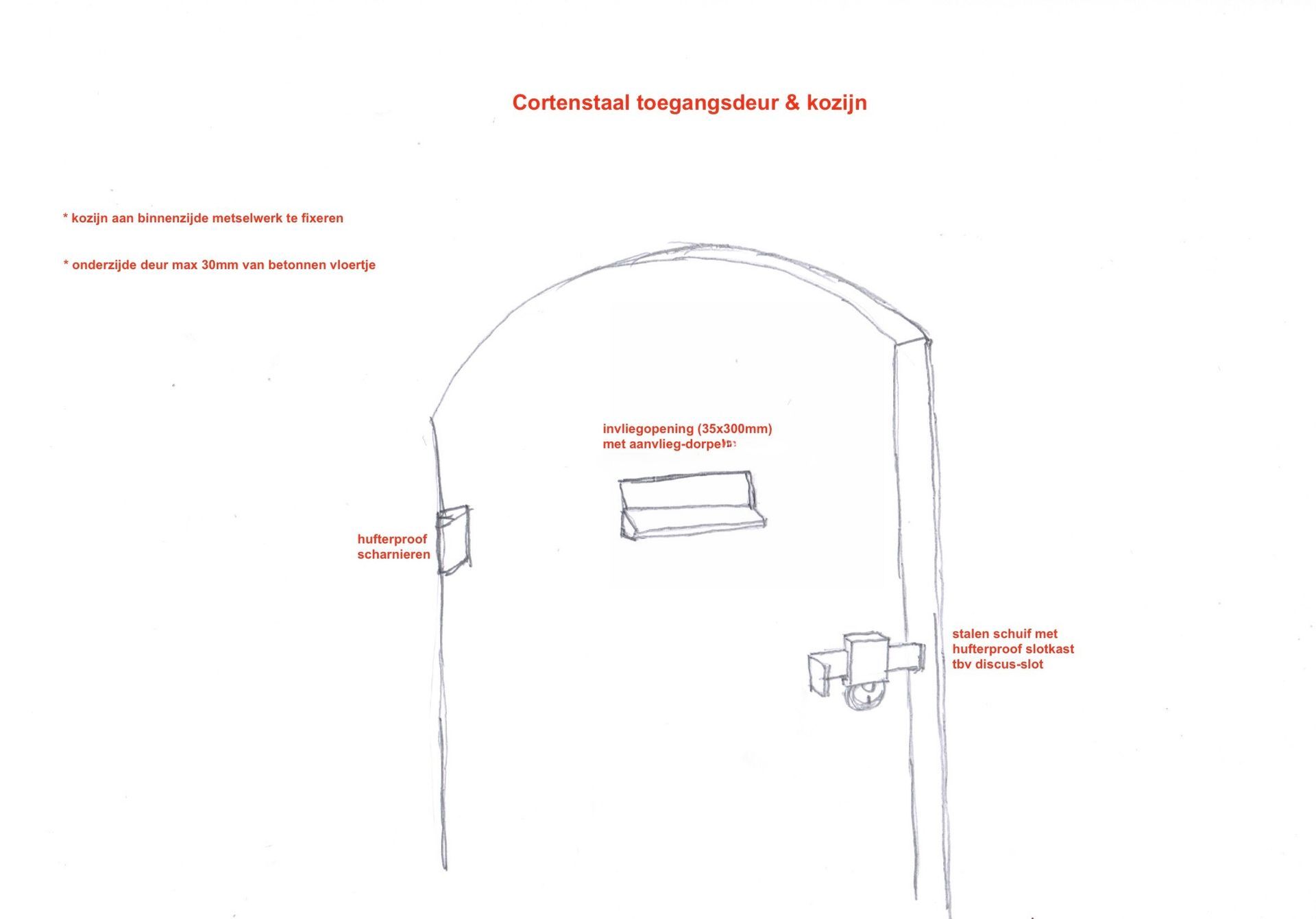 Er is in plaats van een gammele houten, makkelijk open te breken, deur een Cortenstalen deur geplaatst (https://www.hetstaalatelier.nl/) waarin een vuurwerk-proof invliegopening is voorzien. Dit omdat het landgoed dus drukker bevolkt zal worden in de aankomende jaren en er mogelijk meer verstoring zou kunnen plaatsvinden.