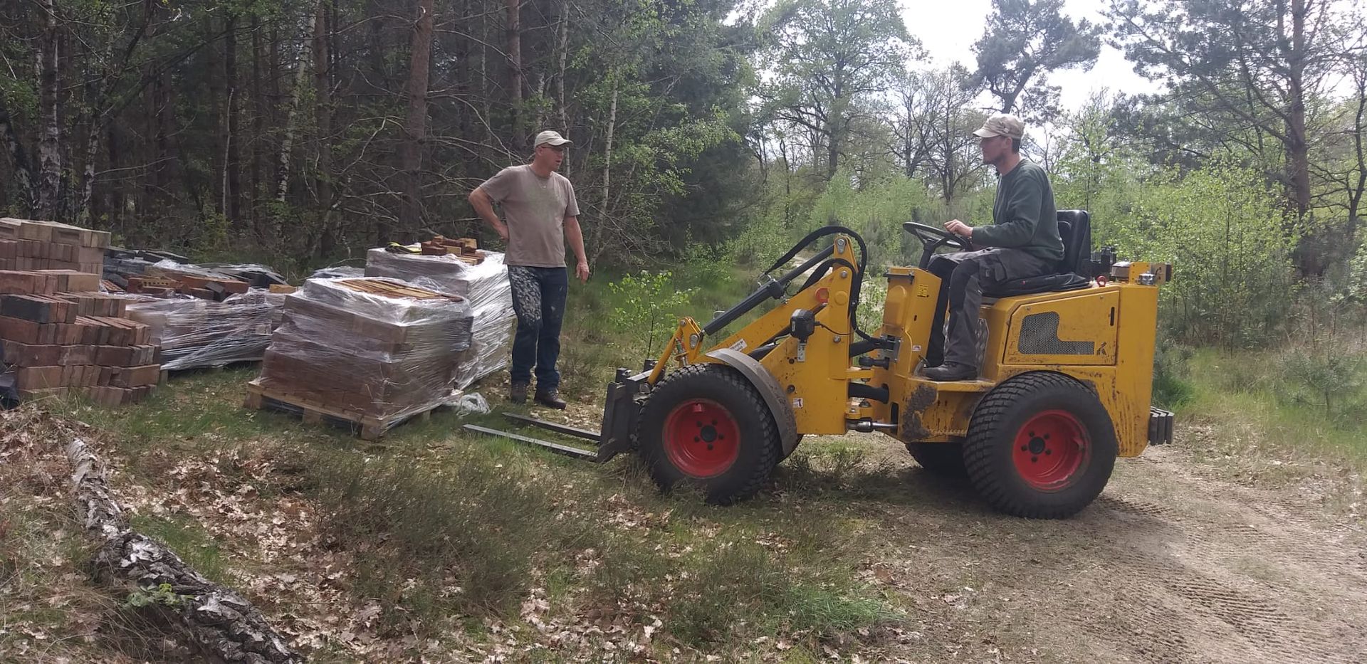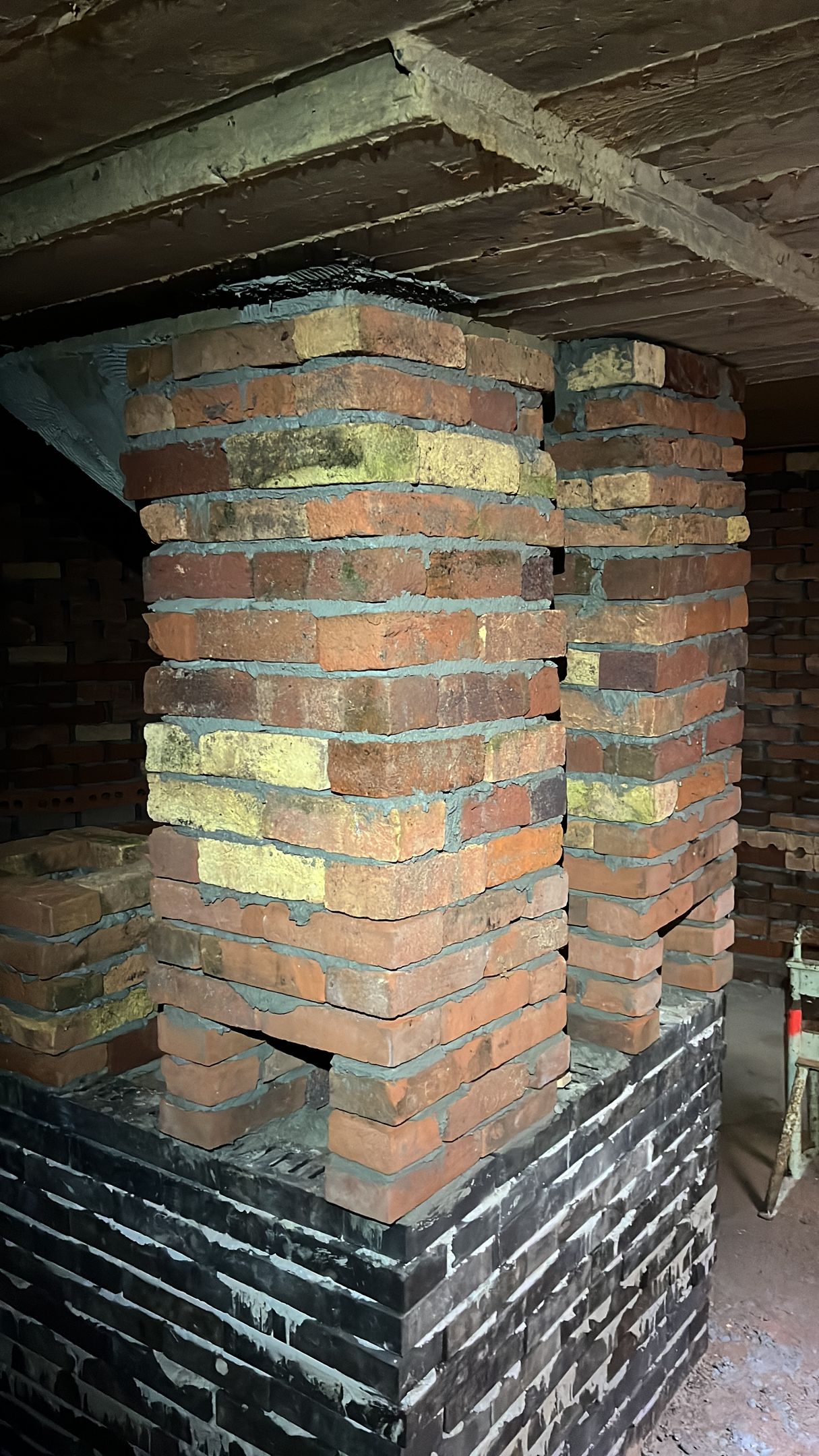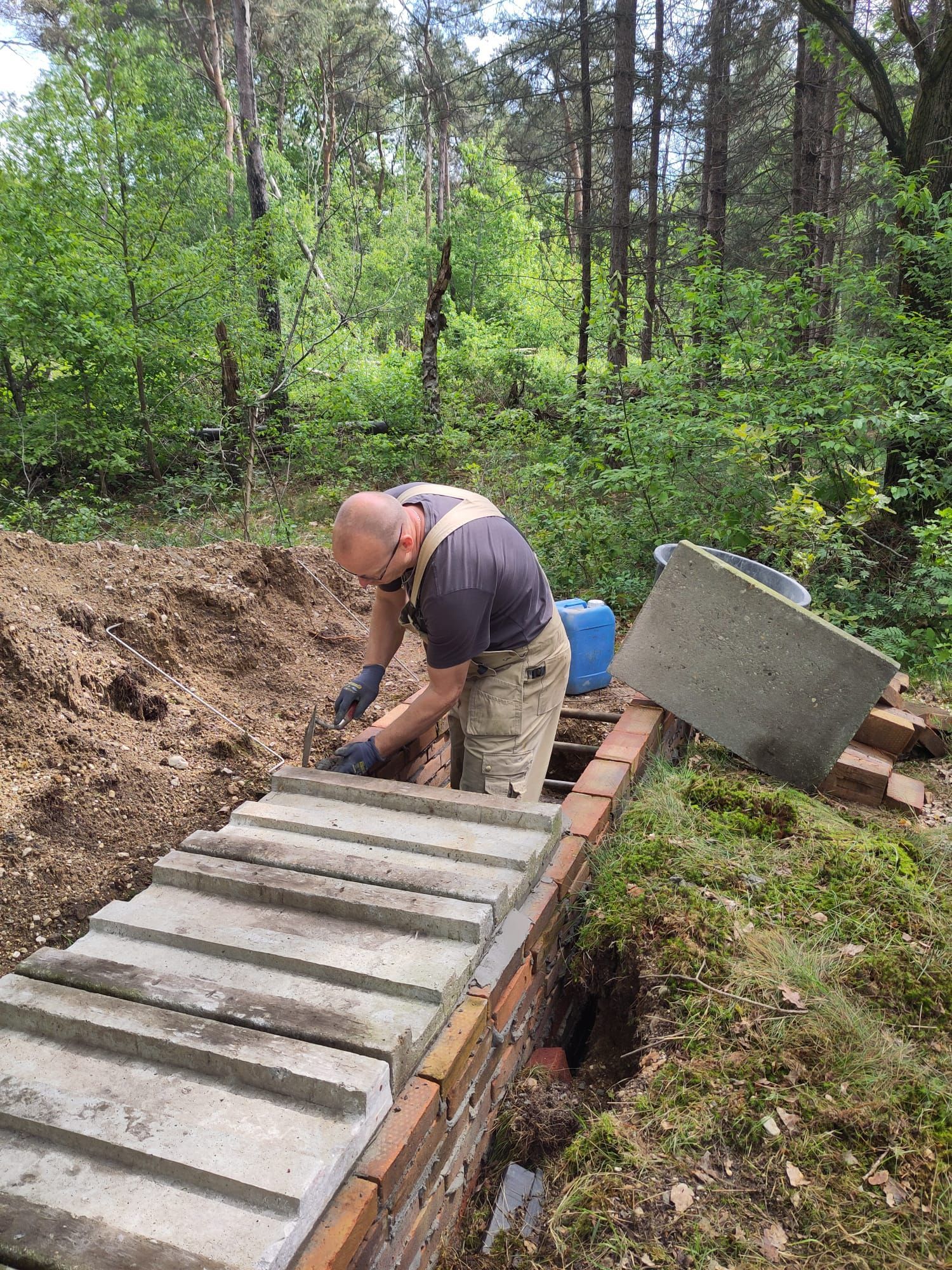 Poreuze handvorm metselstenen nemen vocht uit de lucht op en zorgen zo voor een beter klimaat voor de vleermuizen. Bij de muurtjes hebben we de stootvoegen leeg gelaten zodat de vleermuizen veel wegkruipplekken hebben. De breedte van de stootvoegen variëren (1 - 3 cm) zoveel mogelijk zodat er diverse ruimtes ontstaan. Een vleermuis kan variërend in hoogte, vanaf de vloer tot aan het plafond, in verschillende temperatuur-zones zijn ideale plaatsje zoeken. Dichter bij de vloer is het kouder en hogerop is het relatief iets warmer; voor ieder wat wils. Ook hebben we de ondersteuningskolom voor het dak ommetseld. Eerst een kolom gemetseld waar we een (vochtige) zandbuffer in hebben verwerkt en daarop zijn 'schoorstenen' gemetseld. Vleermuizen houden van variatie qua wegkruipplekken dus we hebben bovenop alle aanpassingen ook extra wegkruipstenen en houtbetonnen vleermuiskasten gemonteerd.