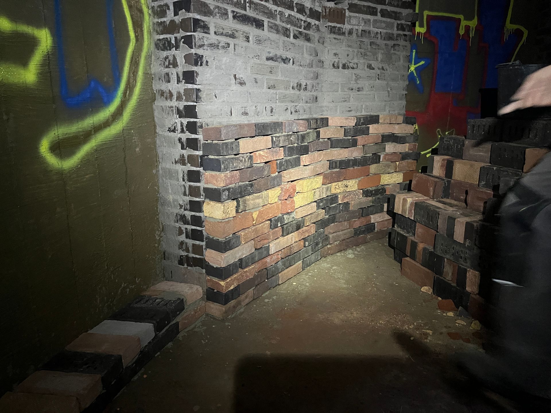 In mei 2023 zijn de niet functionerende betonnen wanden in de bluskelder achter een gemetselde muur van poreuzere stenen verborgen.