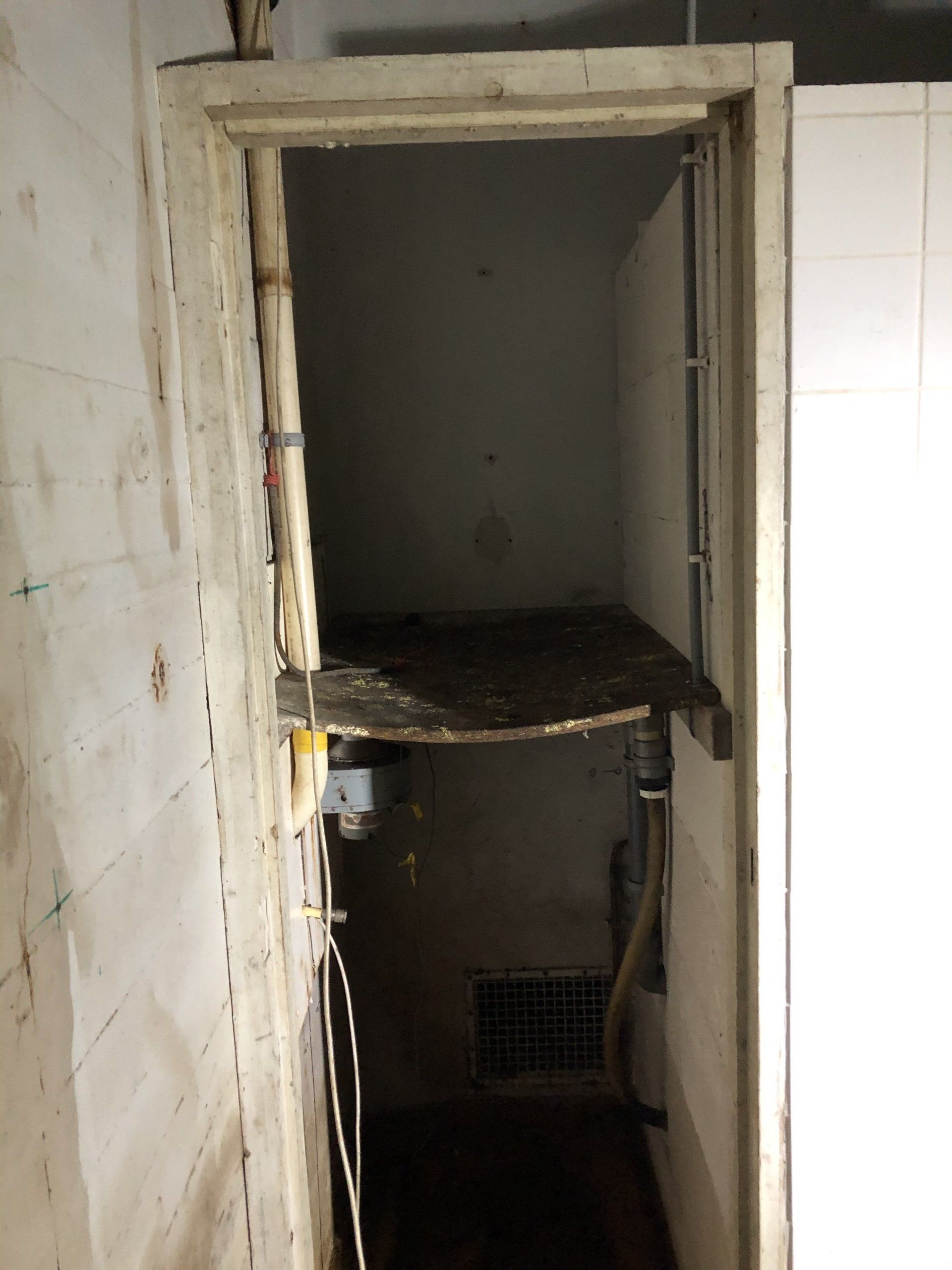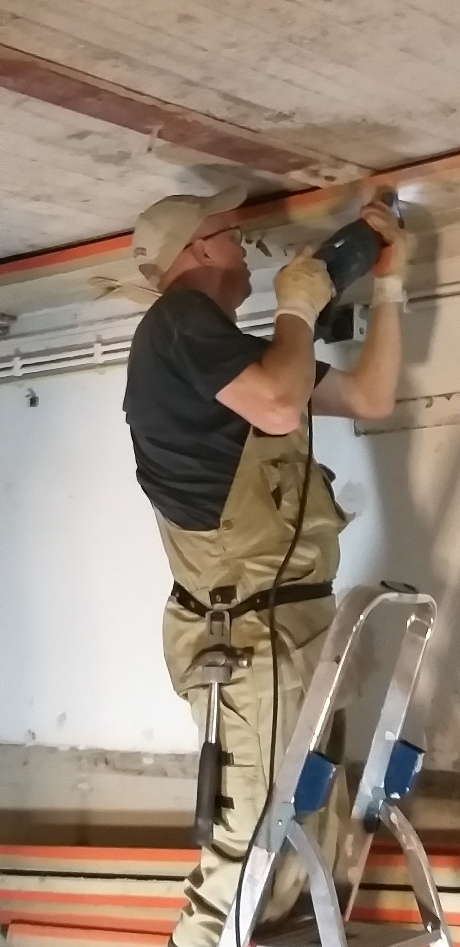 In het voorjaar van 2021 zijn we met hulp van gemeente Uden aan de slag gegaan om het 350m3 grote gebouw te ontruimen. De oude bar, houten lambrisering, houten plafond en de wc werden eruit gesloopt alsook alle andere aan rot onderhevige houten onderdelen werden verwijderd. Hout en vochtige winterverblijven zijn geen goede combinatie en leiden tot hevige schimmelgroei.
