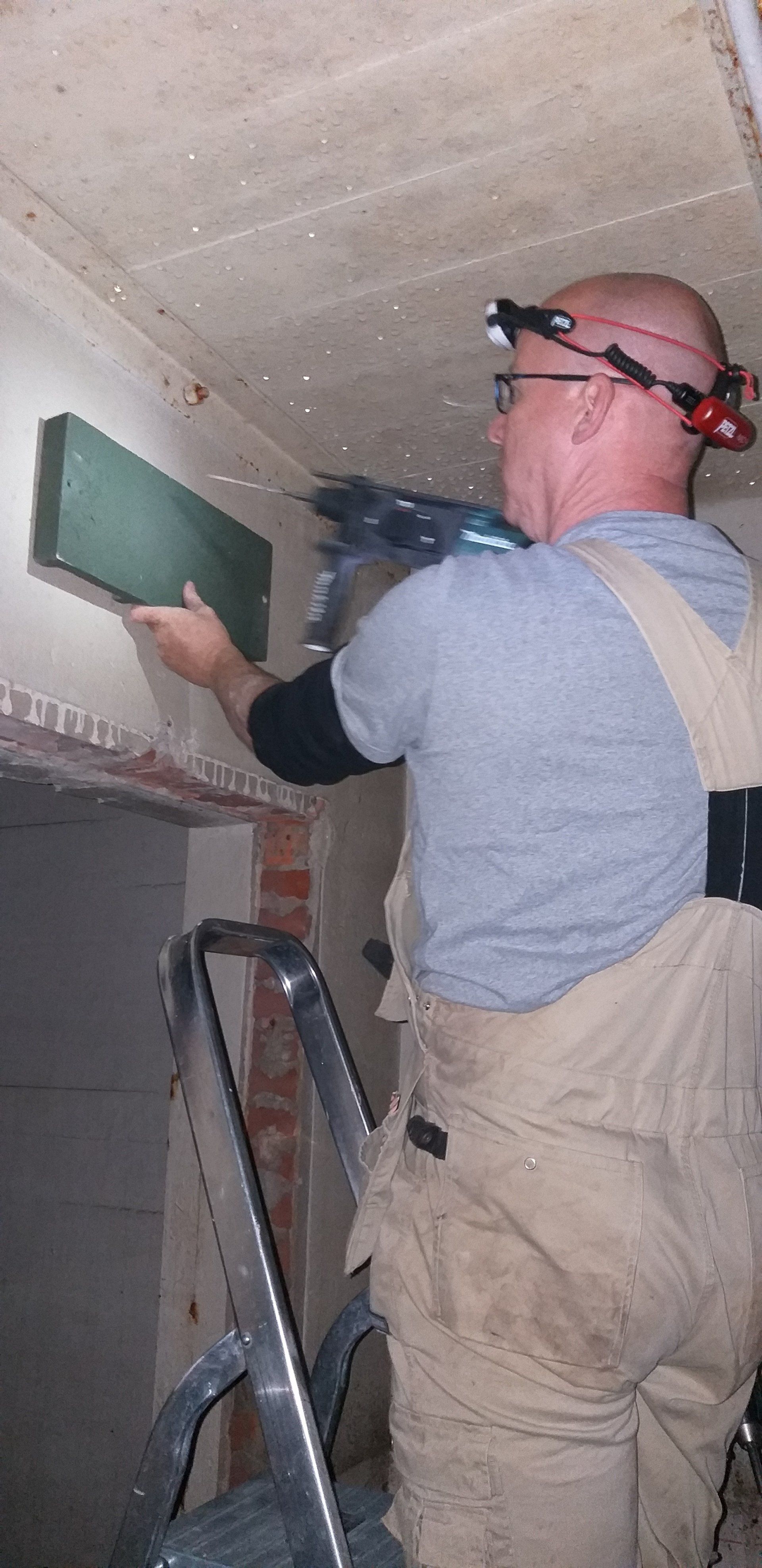 Na het ontruimen zijn we begonnen om wegkruippplaatsen voor de vleermuizen te realiseren door diverse soorten houtbeton vleermuiskasten en wegkruipstenen te plaatsen. Doordat het overgrote gedeelte van de wanden van beton zijn en dus niet makkelijk ruw te maken zijn is dit een goede manier om diverse microklimaatjes te maken. We hebben ook op een paar plaatsen rijen handvorm metselstenen tegen de wanden en het plafond gekit met HighTack-kit. Deze stenen zijn op ca. 1.5 - 2cm van elkaar geplaatst zodat vleermuizen hier tussen kunnen kruipen.