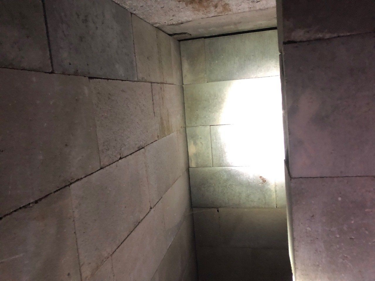 Ondanks goede adviezen en voorbereidingen maken eigenaren soms ook een andere keuze qua materiaalgebruik. Bij onderstaande foto's is er bij de bouw van het winterverblijf gebruik gemaakt van gelijmde holle betonstenen. Dat bouwt natuurlijk een stuk sneller dan met handvorm gebakken metselstenen, maar dit soort open-structuur betonblokken kunnen vocht slecht opslaan/bufferen. Op een van de foto's zie je het vocht in druppels aan het plafond hangen, maar de wanden zijn nagenoeg droog. Het winterverblijf krijgt op deze manier geen goede opbouw qua variatie in klimaatzones. Omdat de blokken gelijmd zijn kan je ook geen (stoot)voegen openlaten om wegkruipplaatsen te realiseren.
