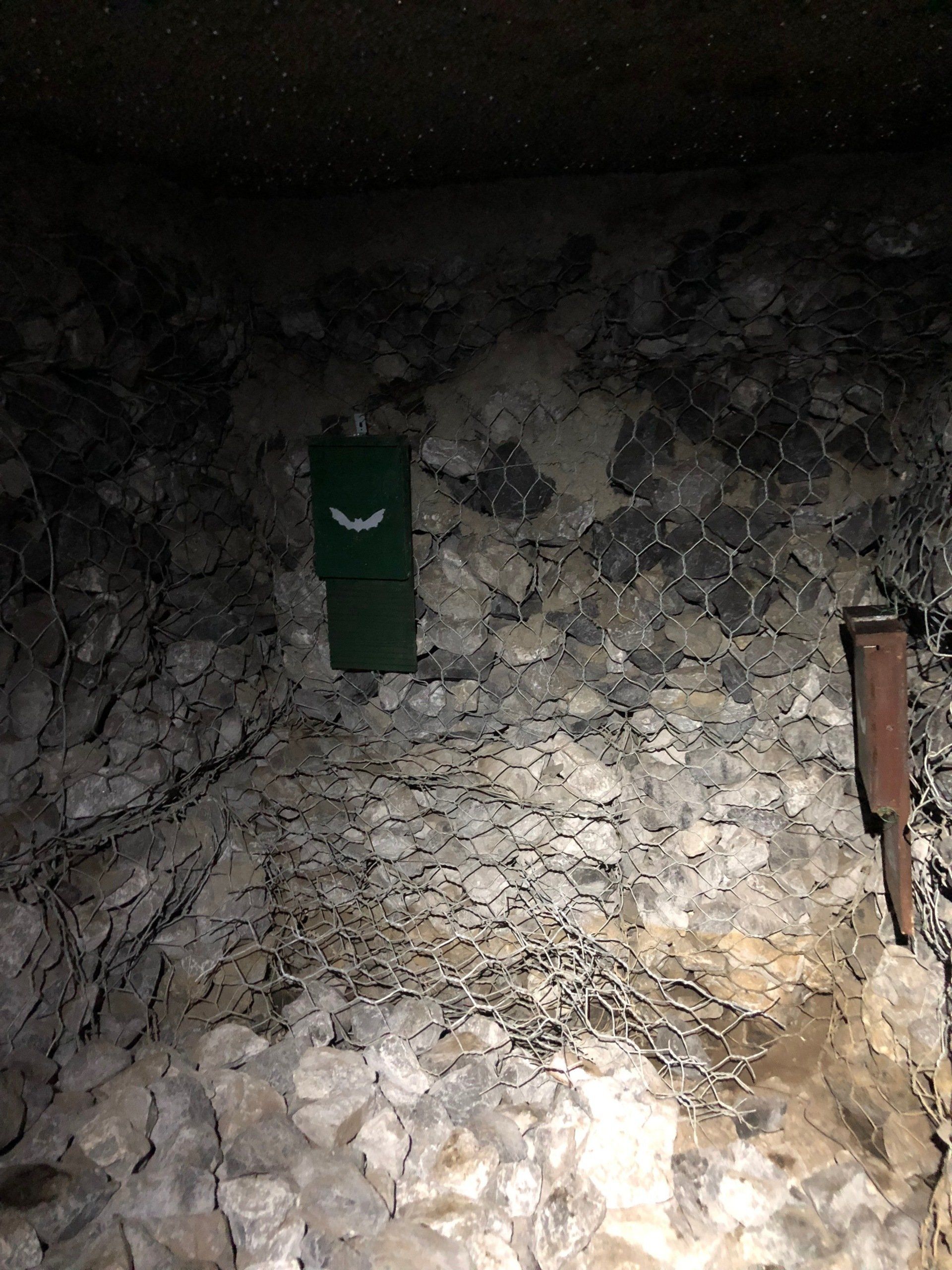 Vervolgens een winterverblijf dat ik ooit tegenkwam, opgebouwd uit stalen gaasnetten met daarin basalt(lava)stenen. Bij dit specifieke winterverblijf kon het vocht te gemakkelijk tussen de basaltstenen weer naar 'buiten' waar een zandlaag over de constructie was aangebracht. Dit winterverblijf was te droog en instabiel qua klimaat. Buiten dat is het voor de wintertellers, mochten er zich per ongeluk wel ooit een vleermuis gaan vestigen, ondoenlijk om de ruimte te controleren op overwinterende dieren. Dit winterverblijf zal, door verbreding van een snelweg, in de aankomende jaren komen te vervallen en er zal op een andere (dichtstbijzijnde) plek een betere herrijzen. Gelukkig werd er door vleermuizen geen gebruik van gemaakt anders had het nog een behoorlijk 'ding' kunnen worden omdat, aangetoond in gebruik zijnde winterverblijven wettelijk beschermd zijn. Dit moet je dus goed beseffen: een door vleermuizen gebruikt winterverblijf mag niet zomaar afgebroken worden!