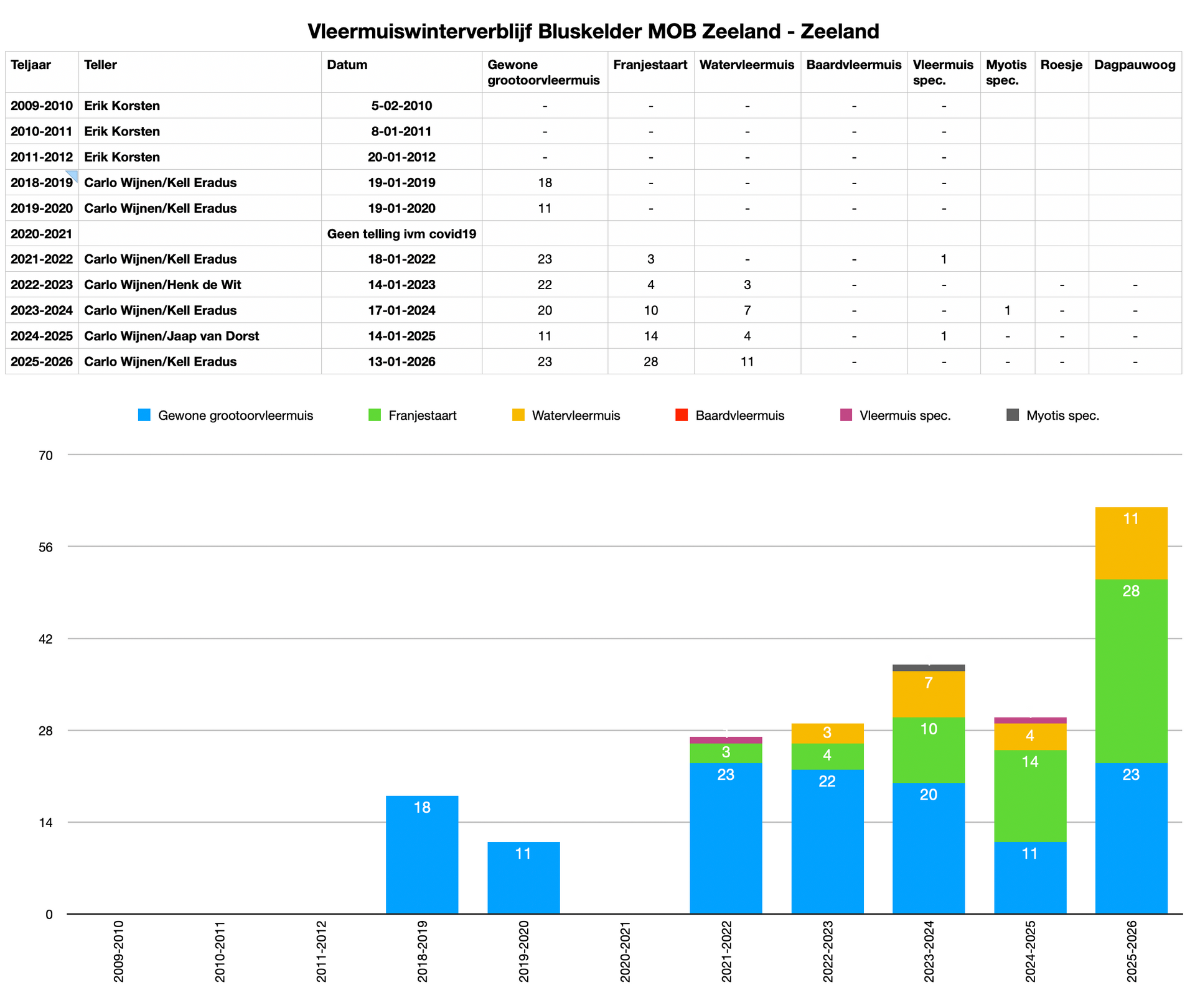 De winter van 2021/2022 had een verrassing voor ons in petto; we telden 23 gewone grootoren en ook de eerste 3 Franjestaarten werden vastgelegd, maar 2022/2023 was zelfs nog beter! We telden 22 grootoren, 4 Franjestaarten en de eerste 3 Watervleermuizen! Watervleermuizen zijn erg conservatief in hun keuze voor een winterverblijf. 2025/2026 was nog beter! (teloverzicht bij onderstaande foto's).