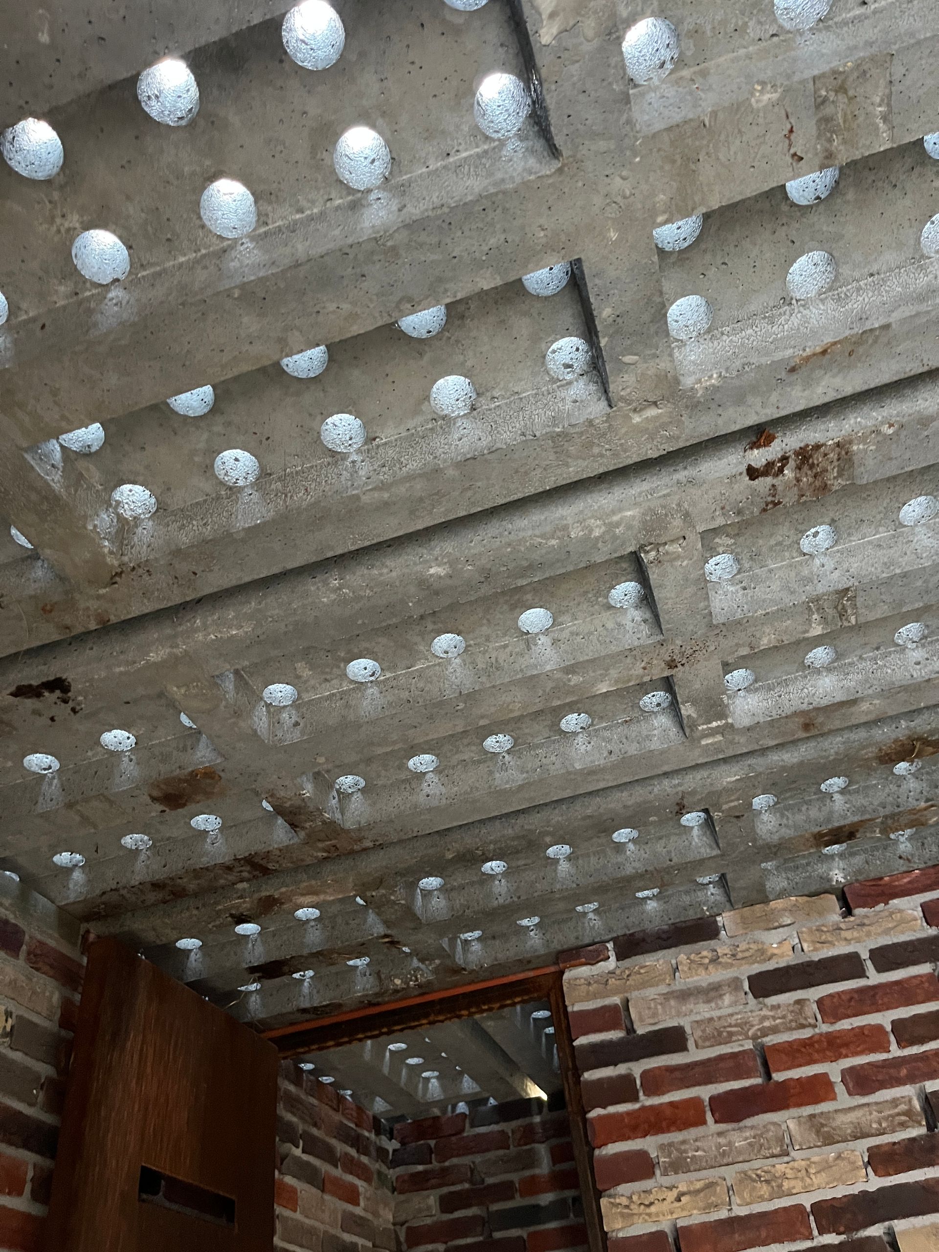 Met het leggen van stroroosters op het metselwerk onstaat er een sterk constructief plafond waar ook nog eens (ca. 1800st.) wegkruipplekken in verwerkt zitten. Door (gebruikte) stoeptegels op de gaten te leggen loopt er geen zand in het winterverblijf. Het gebruik van antiworteldoek raad ik af; geen plastic in de grond! Daar waar de betonplaten elkaar raken ontstaan door de schuine kanten aan de platen mooie wegkruipplekken, maar dit kunnen ook ingangen zijn voor gravende dieren zoals muizen. Deze kieren altijd sluiten, want muizen kunnen rustende vleermuizen aanvreten.